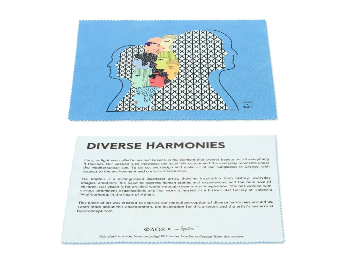 For our second collection, we wanted to highlight the aesthetics and values of FAOS in collaboration with the acclaimed Illustration Artist Antonia Iroidou. The artist curated a unique work inspired by the shared values of both of us, for harmony in the different aspects of people. The project in question will accompany and decorate every packaging of our sunglasses for 2024 in a unique, environmentally friendly way. In addition, numbered and signed by the artist, posters will be available for sale, the proceeds of which will be donated to charity at the end of the year.